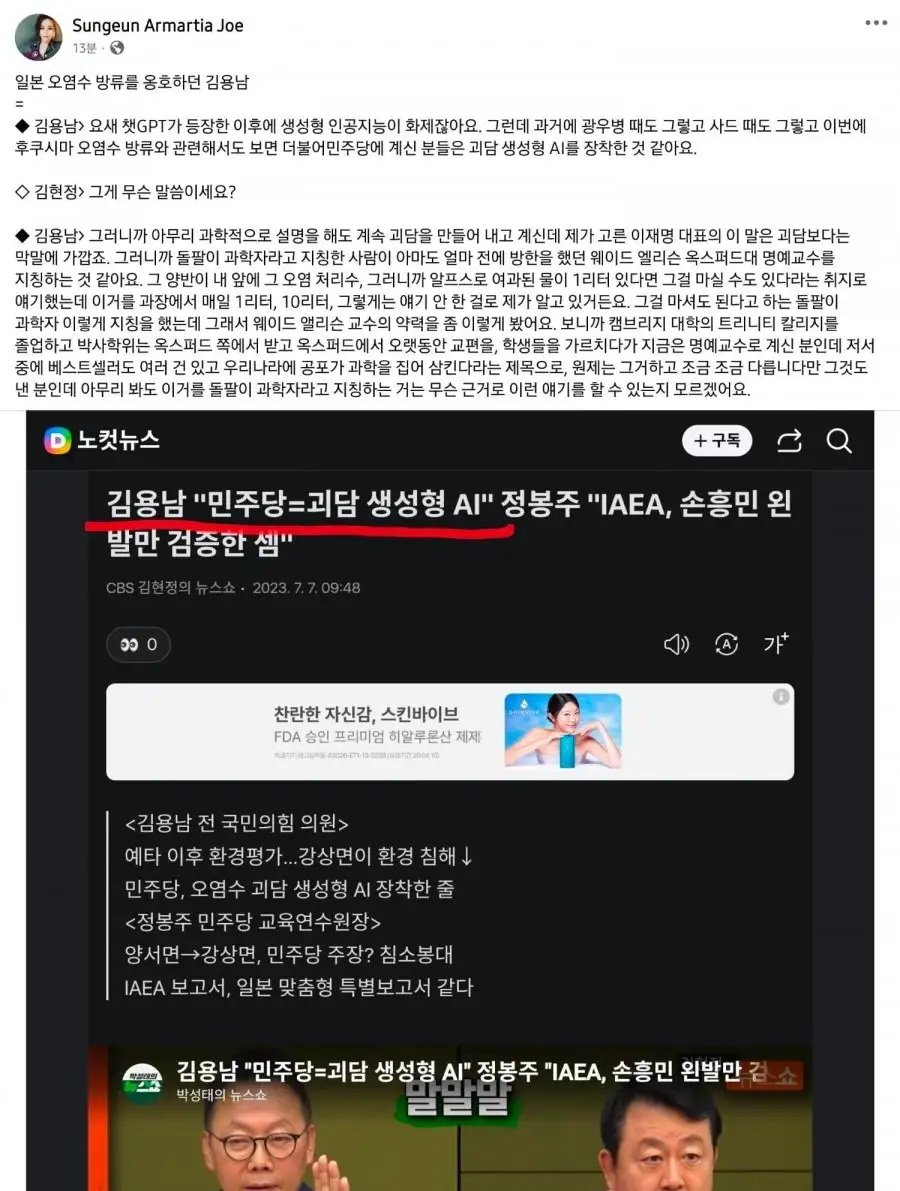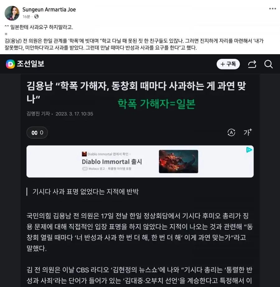 추천 댓글 1공유 신고조성은 페북 - 일본 오염수 방류 옹호하던 김용남solasing2026-04-30 02:44:03조회 177출처: ppomppu.co.kr 일본 오염수 방류 옹호 일본 역사 사과할 필요없다며 학폭가해자 타령 용남아 용남아 김용남아 정신 차리자 정신원문 보기